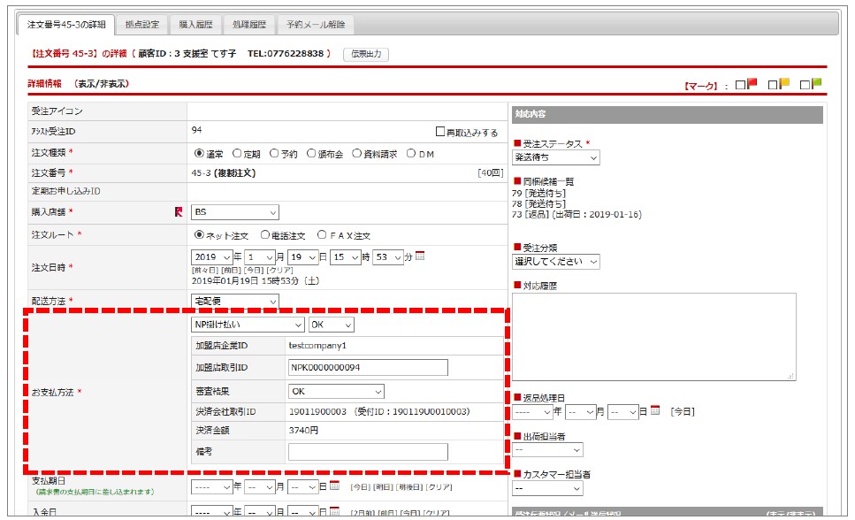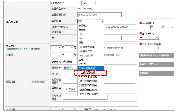 • お支払方法欄に、連携に必要な ID (加盟店企業 ID 、 加盟店取引 ID 、 決済会社取引 ID )情報や審査結果が表示されます。