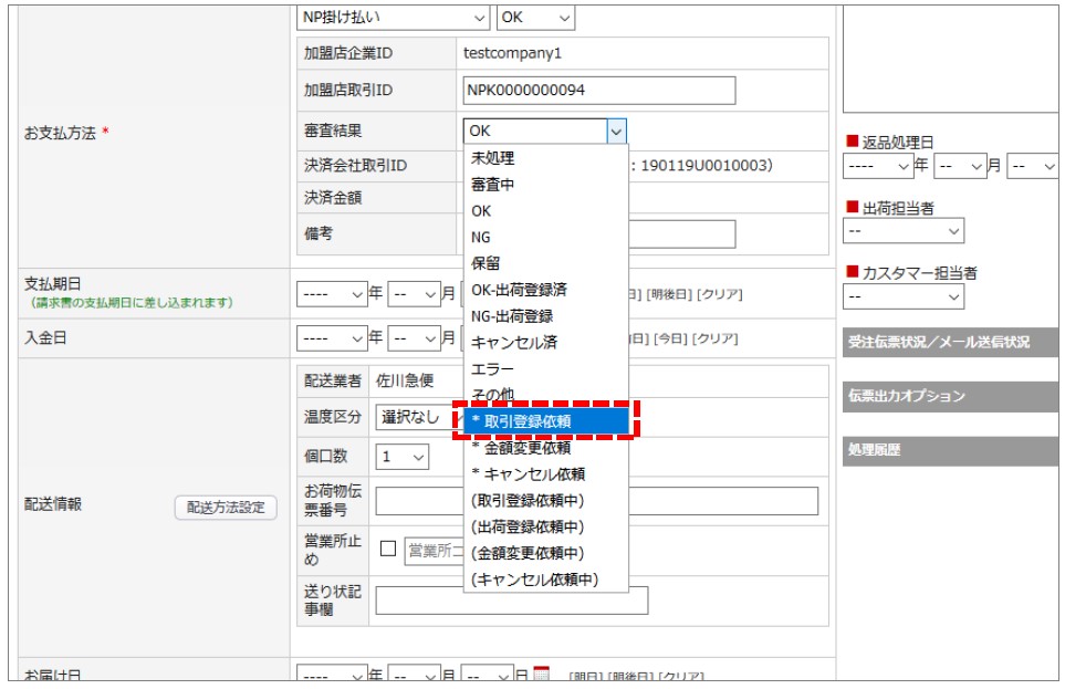 取引登録実施後、審査結果取込み後(OKの場合)、審査結果取込み後(NGの場合)、出荷登録実施後に指定したステータスに移動させる設定が可能です。