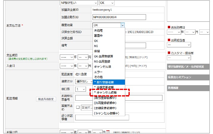 受注登録画面からキャンセル依頼(API連携)を行う場