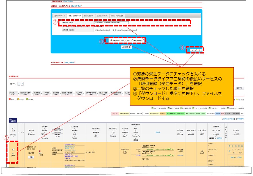 伝票出力・CSV出力パネル>「後払い決済データ」より、取引登録用のCSVファイルをダウンロード可能です。