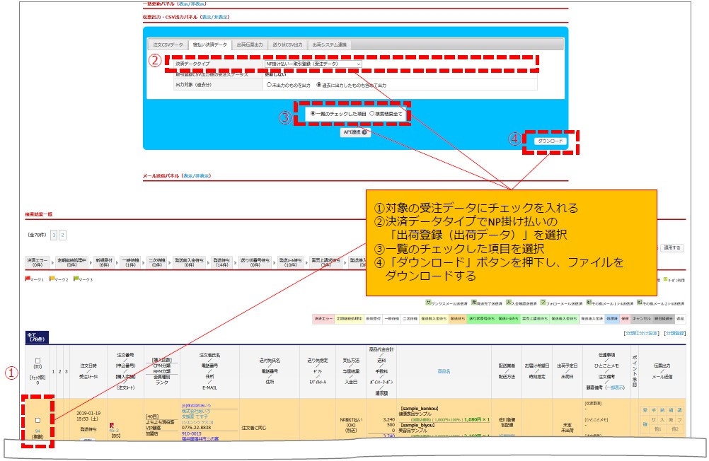 伝票出力・CSV出力パネル>「後払い決済データ」より、一括での出荷登録が可能です。