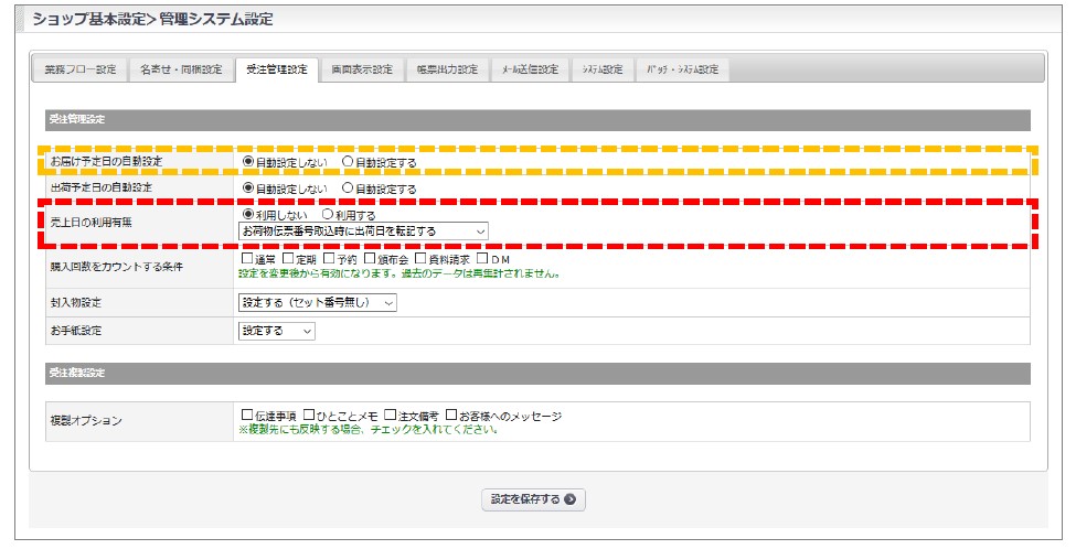 【設定画面】 ショップ基本設定>管理システム設定>受注管理設定タブ