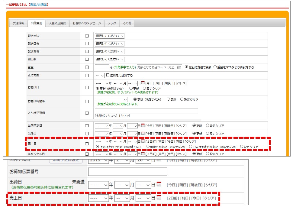 売上日の修正は受注一覧の一括更新パネルまたは受注詳細画面より編集が可能です。