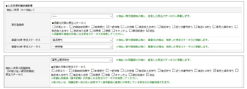 自動取引登録の推奨ステータスは「一時待機」以降、自動出荷登録の推奨ステータスは「発送後入金待ち」以降です。 - 審査結果に応じたステータス移動の設定