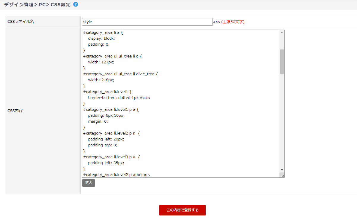 レイアウトやカラーなどデザインを設定する 目次 店舗全体のデザインを変更する デザイン改善機能 よくある質問・目的 デザイン関連設定 ページレイアウトの変更方法について(高度な設定) フロントページにカテゴリが表示されない ページ設定 カスタムページ設定 ヘッダー・フッター・レフトナビ設定 レフトナビが表示されない フォントサイズを変更したい フロントページの表示を確認中に不正なページ遷移と表示されるのですが 商品一覧ページのデザインを調整する ページ設定 よくある質問・目的 商品一覧ページの表示形式について 商品名の省略を解除して全文表示させたい 商品一覧ページの列数を変更したい 商品一覧画面でキーワード検索をしたとき、商品の絞り込みが行われず全商品表示されるのですが、解決方法を教えてください 商品ページのデザインを調整する 出品商品登録 よくある質問・目的 商品登録画面のSEO設定「h1」はどこに反映されるか 商品出品登録の画像サイズについて 商品ページに動画をアップしたい 商品一覧、商品詳細ページにて商品ステータスの画像を追加したい PC用商品ページでの商品情報レイアウト(テンプレートA~G) フォーム一体型LPページ関連 フォーム一体型LP機能 よくある質問・目的 フォーム一体型LP設定 フォーム一体型LPで定期商品の「2回目以降合計価格」表示を削除したい LPのフッターに会社概要ページを追加したい 入力欄の初期値として設定されている薄い文字を変更したい 複数商品選択方式のフォーム一体型LPで、タグなどの要素クリックで選択商品を切り替える方法 他サイトからスマレジEC・リピートのLPへ購入商品を選択した状態で遷移させたい フォーム一体型LPページにアンケートを設置したい 「metaタグ description」にはどのような内容を入力すればいいですか 独自デザインCSSの反映について スタイルシート設定 よくある質問・目的 CSSの設定について スマレジEC・リピートで使用しているCSSについて 特定の場合のみCSSやJSを反映させる設定について 新しくCSSを追加し、カスタムページなど個別に反映させることは可能か フロントのデザインを調整する よくある質問・目的 フロントの商品詳細画面について【カゴに入れる】ボタンの色や文言を変更したいので、変更方法を教えてください フロントの買い物カゴ画面についてページタイトル下、背景色のある部分の文章の変更方法を教えてください 入力内容のご確認画面で商品名に表示されるメッセージ内容の設定箇所を教えてください その他デザイン管理の機能を利用する よくある質問・目的 目玉商品の設定 店舗内ランキングの設定 最近チェックした商品の設定 カスタムコンテンツ機能 並び順設定 画面メッセージ設定 デフォルト表示の画面メッセージを消したい Goolge chromeなどブラウザでサイトを開いた際のタブに表示される文言を編集したいのですが設定箇所を教えてください