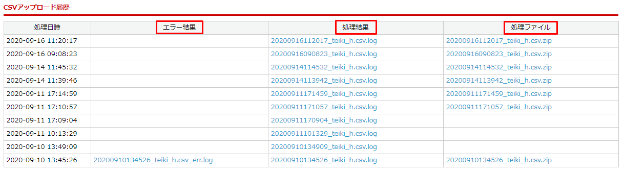 各ファイル種別ごとに、アップロードしたCSVの履歴が表示されます。