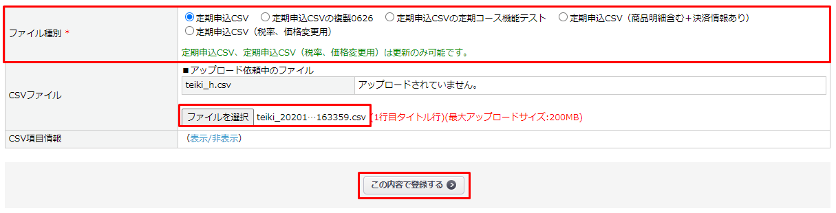 ※定期申込CSV、定期申込CSV(税率、価格変更用)は更新のみ可能です。