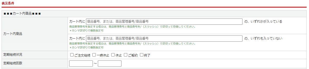 ※ページで「定期購入お申し込み一覧」を選択した場合、表示条件の■■■カート内商品■■■で「定期継続状況」と「定期継続回数」を設定することができます。