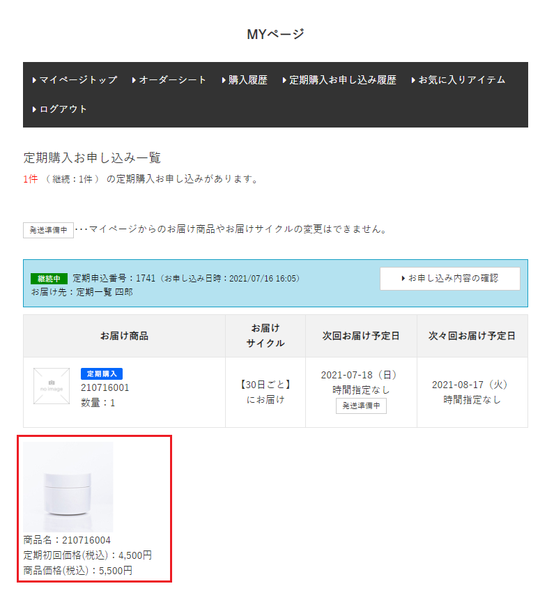 • ページを[定期購入お申し込み一覧]に設定した場合、MYページの定期購入お申し込み一覧に表示されます。