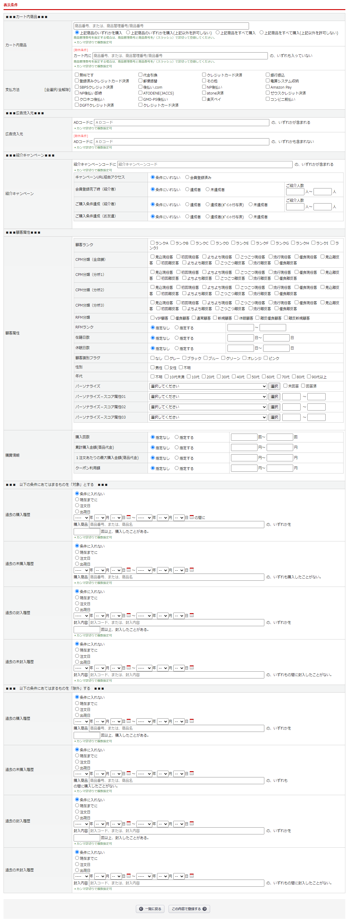 顧客属性 顧客ランク、CPM/RFMなどの属性を指定できます。