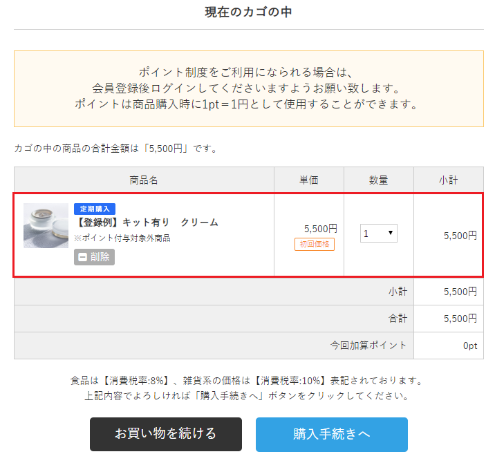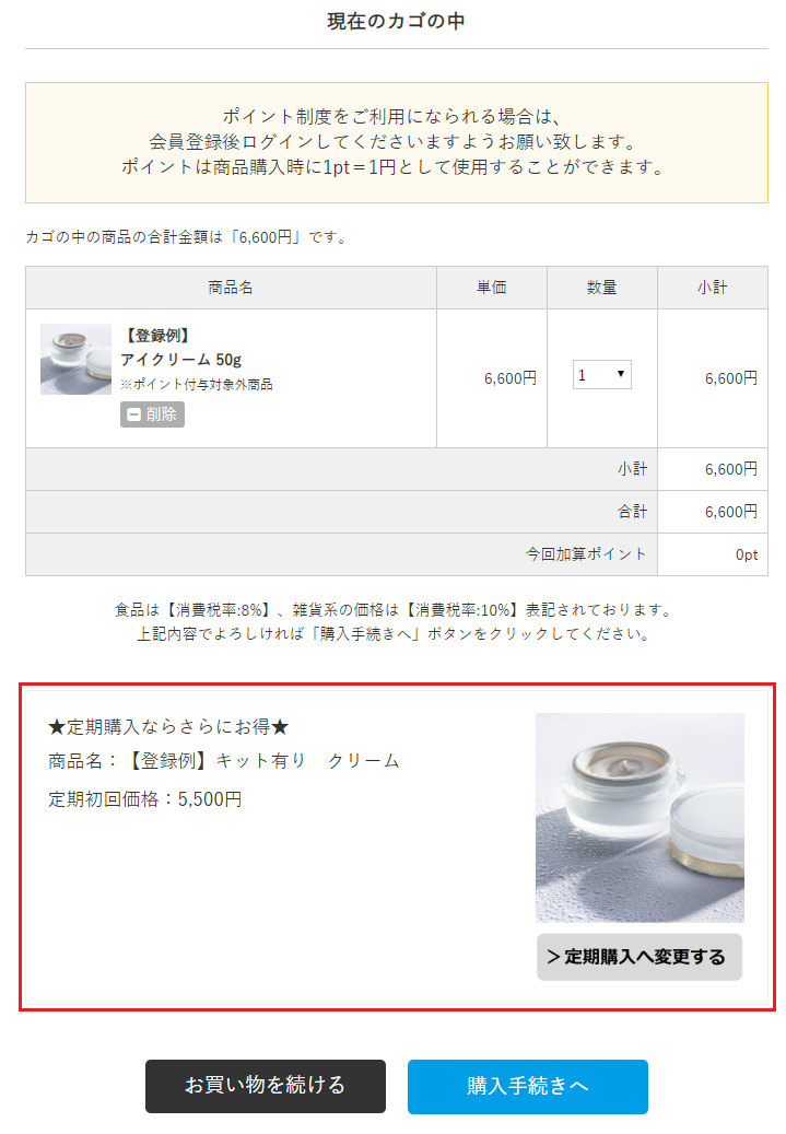 画像をクリックすると、通常から定期商品へカート内の商品が置き換わります。