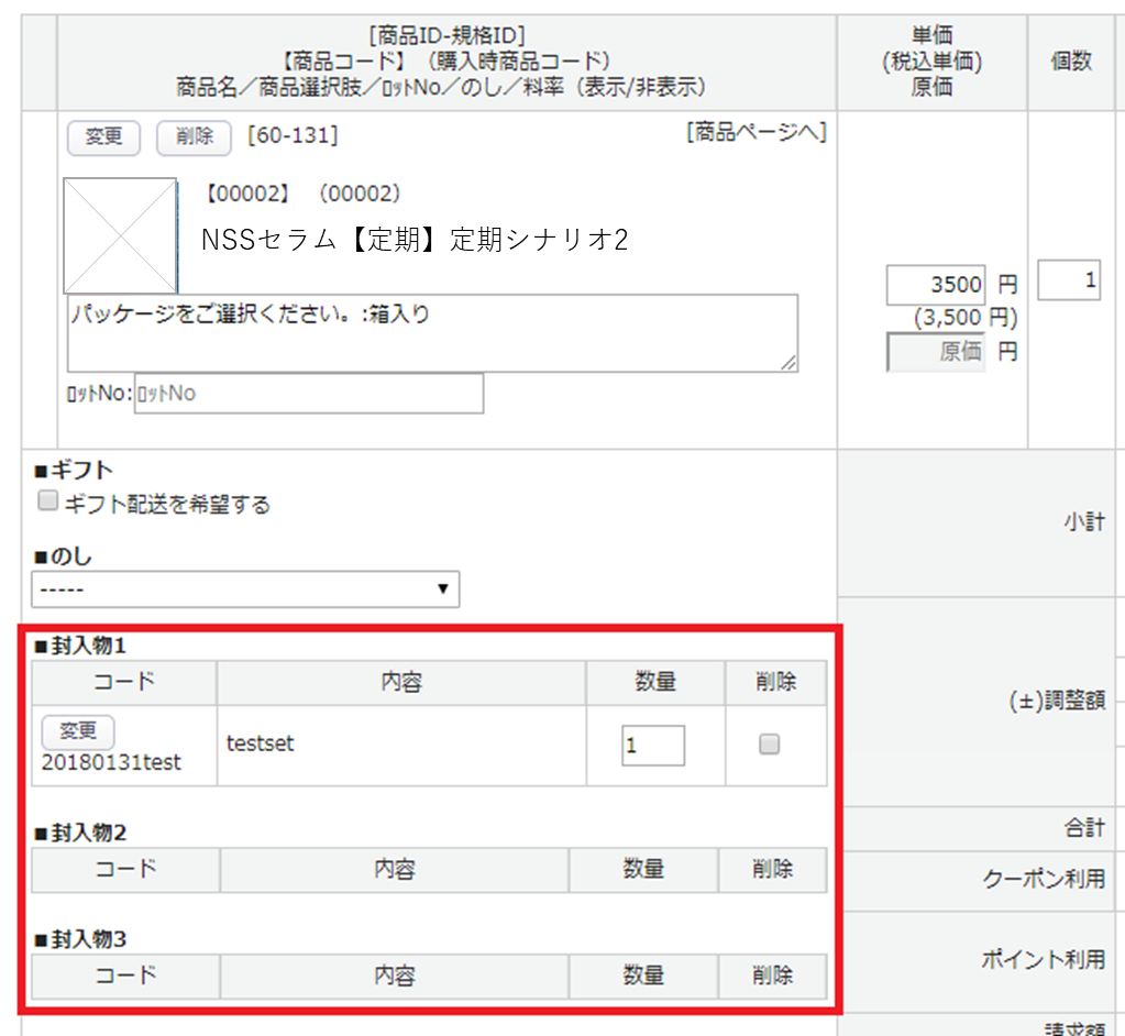 登録した封入物種別によって、受注詳細への反映場所が変わります。