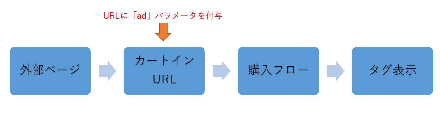 指定の外部URLから流入時にタグを表示させるには、スマレジEC・リピートのカートインURLに「ad」パラメータを持たせることで、リファラーURLに設定したADコードと一致させて表示します。