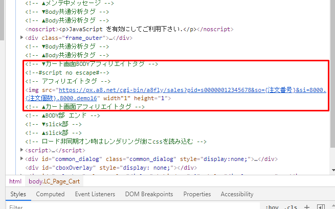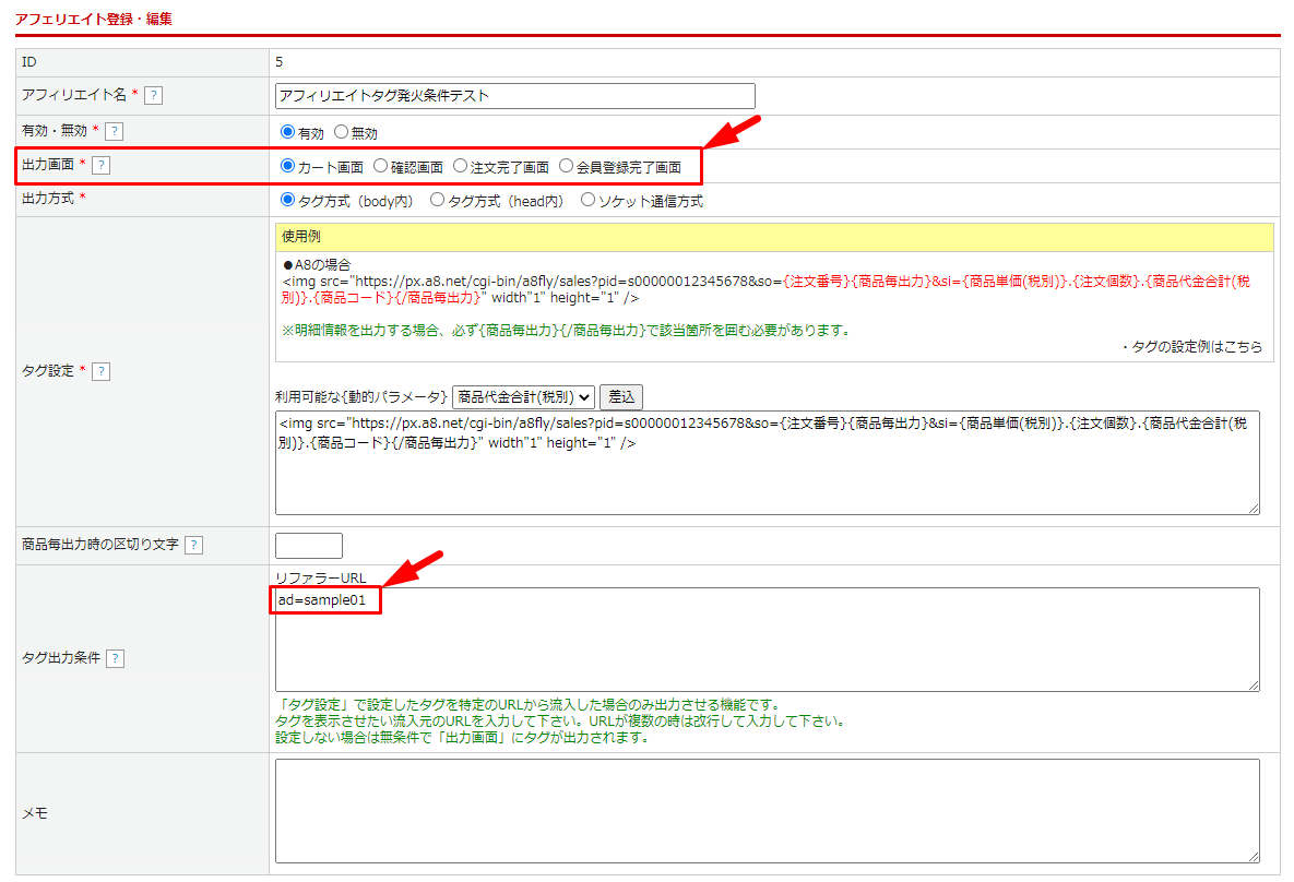 ②で「ad」パラメータを持ったURLを記憶しているため、アフィリエイト設定のリファラーURLに同じADコードを登録することで、”出力画面”で設定した画面にタグが表示されます。