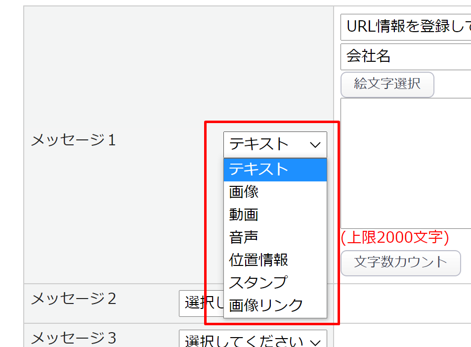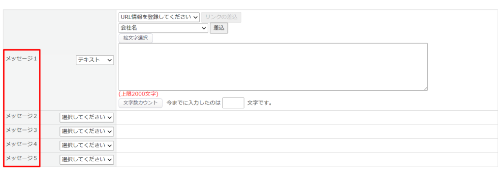 メッセージは、「メッセージ1」~「メッセージ5」欄のそれぞれを設定することで最大5つのコンテンツを一度に送信することが可能です。