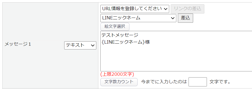 テキストべ―スでのメッセージの送信設定です。差し込みタグ{LINEニックネーム}がご利用可能です。