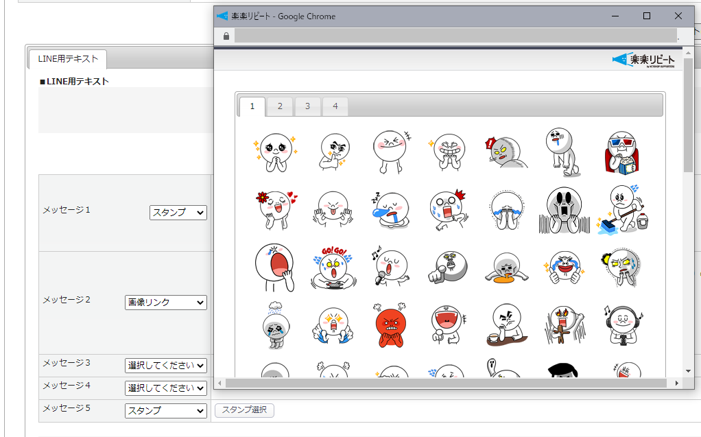 【スタンプ選択】ボタンをクリックすると表示されるウィンドウにて、送信するスタンプを選択してください。