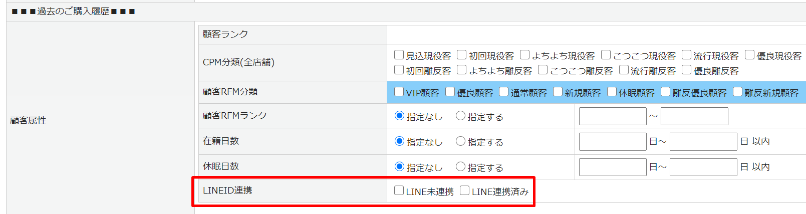 絞り込みパネルにLINE連携に関する条件項目が追加され、配信対象とする顧客を絞り込む事が可能です。