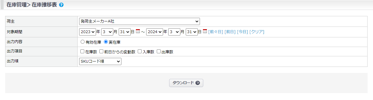対象期間の在庫数の推移をCSVデータファイルでダウンロードできます。