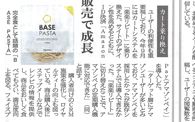 日本ネット経済新聞2017年12月7日号「進化するリピートEC」特集に、ベースフード様のご利用カートとして「楽楽リピート」が掲載されました。