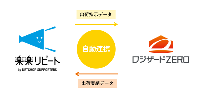 楽楽リピートで管理する受注データを、出荷指示データとしてロジザードZEROに取り込みます。ロジザードZEROにて出荷指示・お買い上げ明細書等の帳票出力・引当・ピッキング・検品を管理、梱包・出荷後に出荷実績データを楽楽リピートへ返します。