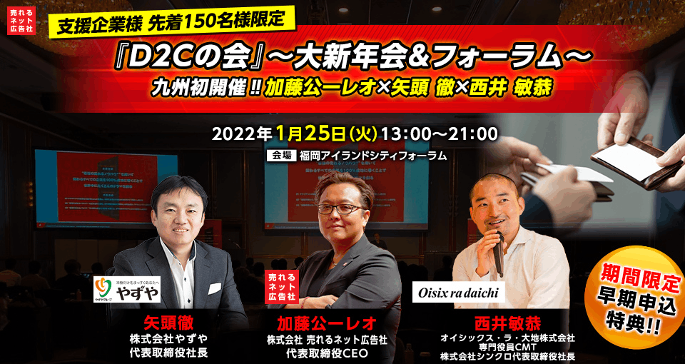 今回、売れるネット広告社では、なんと今回史上初となる、売れるネット広告社創業の地”福岡”にて、「D2Cの会」~大新年会&フォーラム~を開催することになりました!