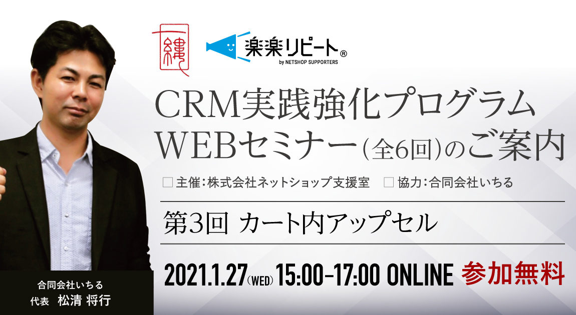 今回、そういった状況を憂慮された、他のECカートユーザーなどの俯瞰した情報や具体的知見をお持ちの「日本唯一無二のCRM専門コンサルタント」合同会社いちるの松清代表のお力をお借りして、30万円相当の「CRM実践強化プログラム」WEBセミナー(全6回)をなんと完全無償にて実施させていただく運びとなりました。