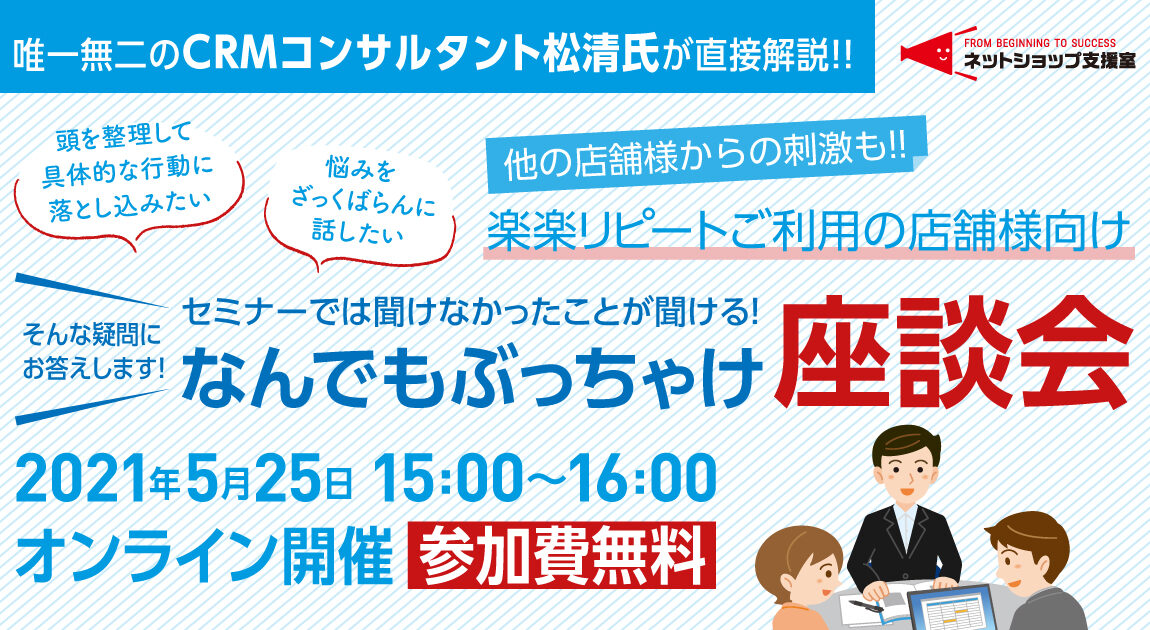 | 参加資格 | ネットショップ支援室ご契約者様 ※CRMセミナーに参加された店舗様も、参加出来なかった店舗様も座談会にご参加頂けます。 ※コンパクトに要点を絞って進めていきますので、事前アンケートに必ずご回答ください。 |