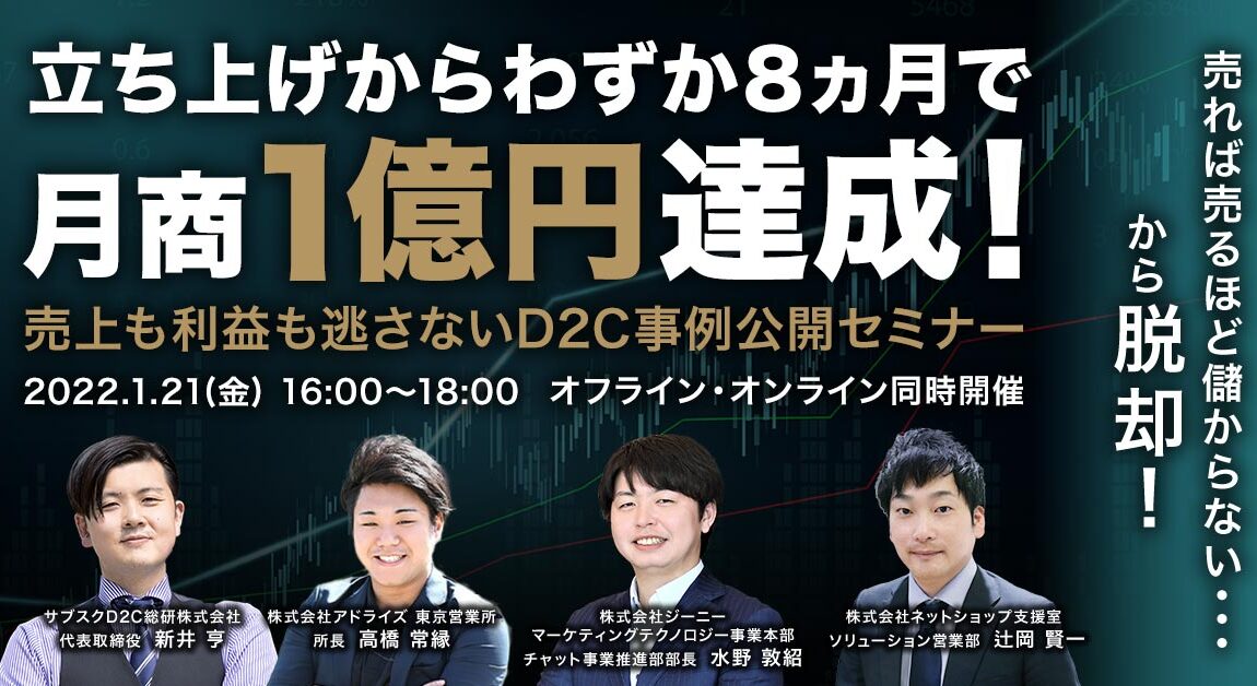 | タイトル | 【売れば売るほど儲からない・・・から脱却!】 立ち上げからわずか8ヵ月で月商1億円達成!売上も利益も逃さないD2C事例公開セミナー |
