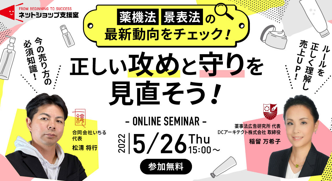 本セミナーでは「薬機法」「景表法」の最新動向を踏まえた広告表記やCRM施策など、EC運用における攻めと守りの手法をご講演いただきます。