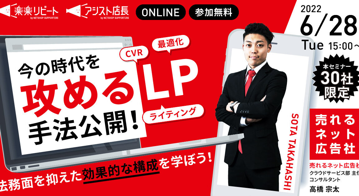 今回は、クライアント目線で“確実性”のある広告を実現するために、“1200回以上”の【A/Bテスト】を 繰り返し“最強の売れるノウハウ”を導き出している「売れるネット広告社」より講師をお招きし、最新の「売るためのLP」についてご講演いただきます。