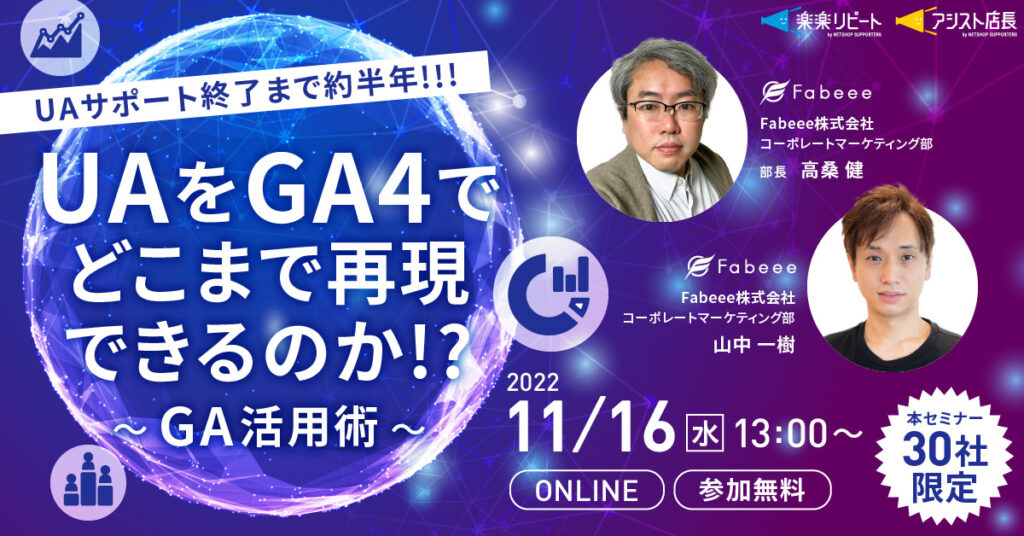 | タイトル | 【UAサポート終了まで約半年!!!】UAをGA4でどこまで再現できるのか!?~GA活用術~ |