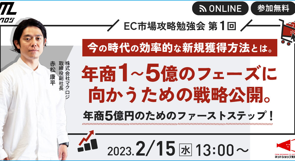 ネットショップ支援室とご契約をいただいている皆様限定に、ECのコンサルティングから運用代行まで行うマクロジ様より結果を出し続けている【年商5億目指すための販路拡大施策】を共有いただくセミナーです。