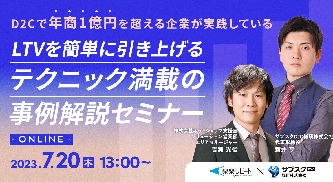 EC業界未経験から社員たった1名、設立わずか1年で年商10億円を突破し、驚異的な単品リピート通販のビジネスモデルを構築した、サブスクD2C総研株式会社 代表取締役 新井亨氏の事例紹介を中心に、LTV最大化のためにすべき対策、顧客ファン化のためのポイント、等…売上がアップした実際の戦略を解説します!