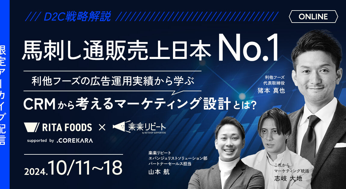 本セミナーは、馬刺し通販業界で日本No.1の売上を誇る利他フーズの成功事例をもとに、CRM(顧客関係管理)を中心としたマーケティング設計の秘訣を解説します。