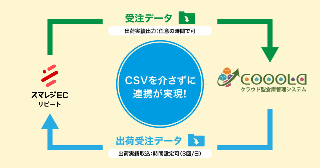 『スマレジEC・リピート』の受注データの『COOOLa(クーラ)』への連携、『COOOLa(クーラ)』の出荷実績データの『スマレジEC・リピート』への連携をCSVファイルを介さずシステム間連携によって実現することができ、『スマレジEC・リピート』、『COOOLa(クーラ)』のそれぞれのユーザのデータインポート・エクスポート業務を削減できるようになり、人的ミスを減らします。